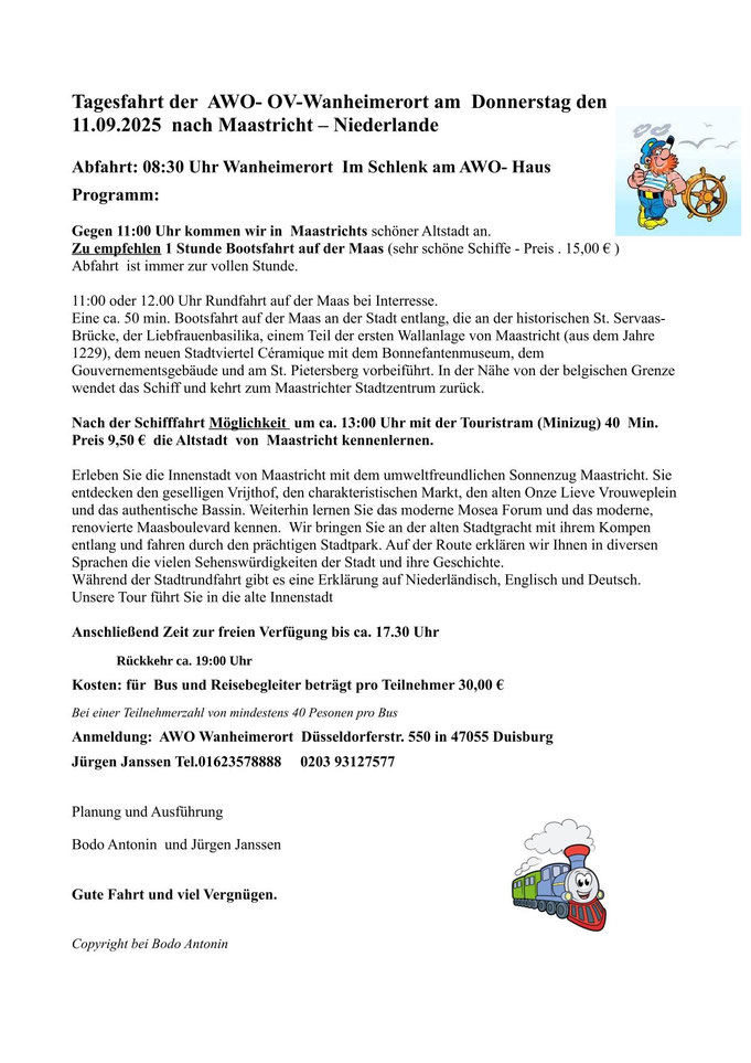 Die AWO Wanheimerort veranstaltet am 11. September eine Tagesfahrt nach Maastricht, und es sind noch Plätze frei. Genaueres kann dem angehängten Flyer entnommen werden.